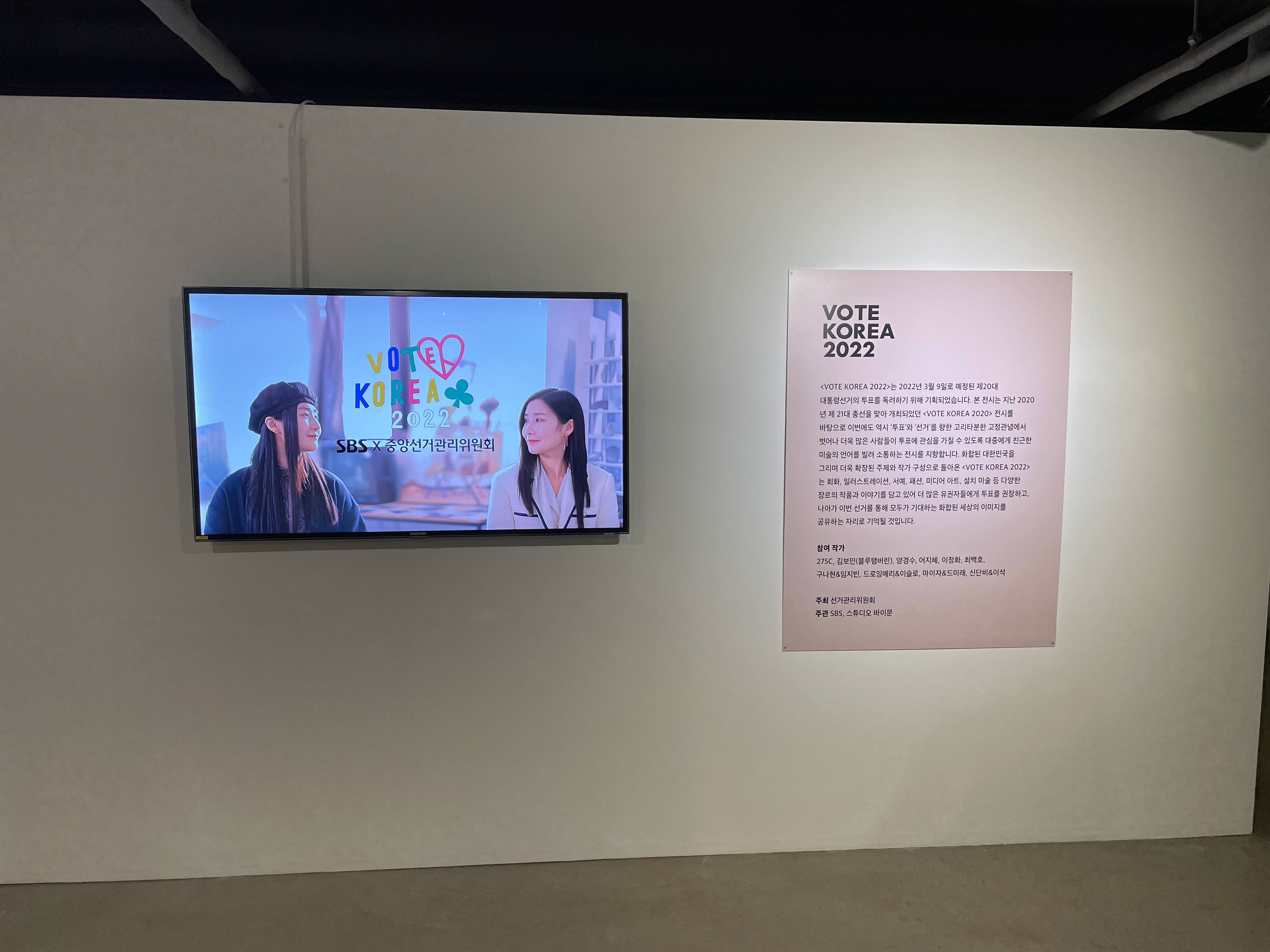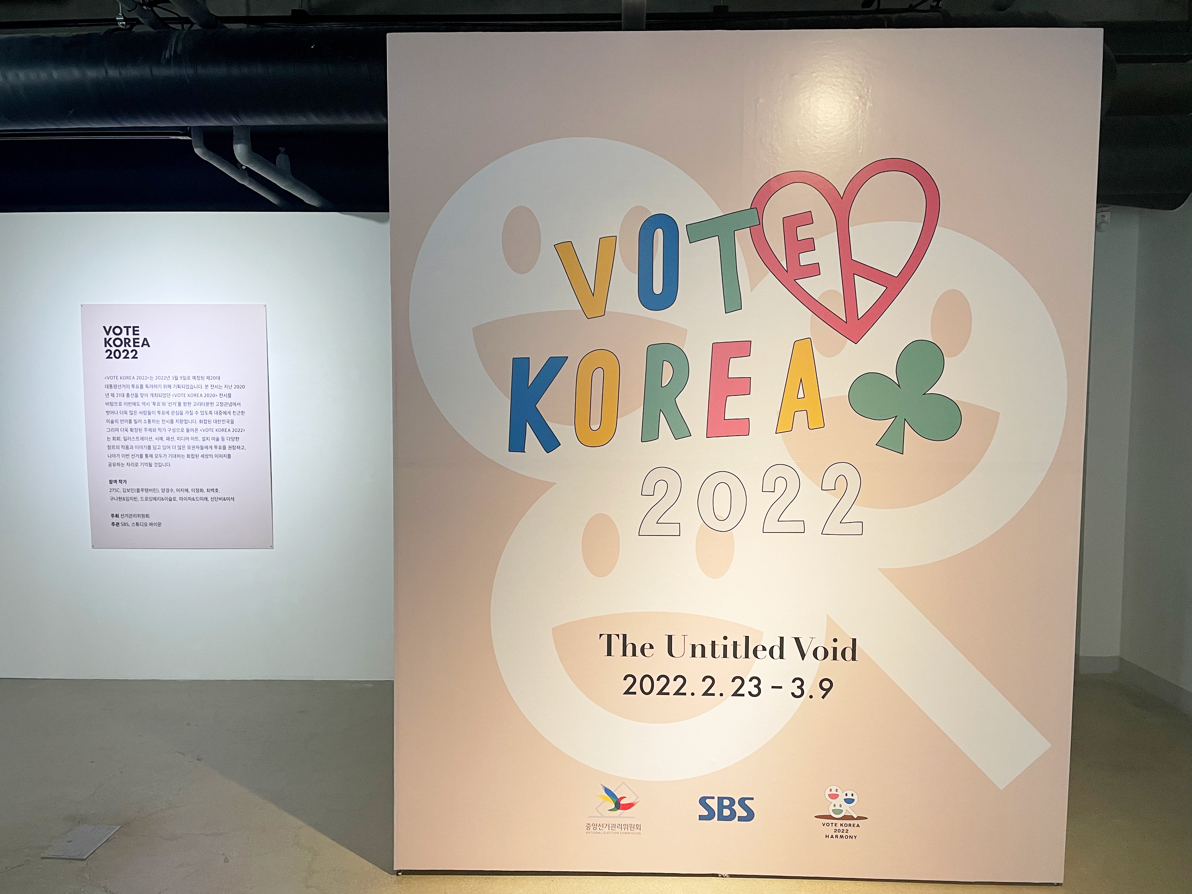 Exhibition period: february 23, 2022 – march 09, 2022 Location: 디 언타이틀드 보이드 갤러리 The Untitled Void gallery (3-5, Gyeonghuigung 3-gil, Jongno-gu, Seoul, Republic of Korea) Participating Artists: MY-JA & Demilé 마이자&드미래, 275C, 김보민, 어지혜, 양경수, 이정화, 최백호, 구나현&임지빈, 드로잉메리&이슬로, 신단비&이석 Hosted and Organized by: 중앙선거관리위원회, NEC 1963, SBS, Studiobymoonn,